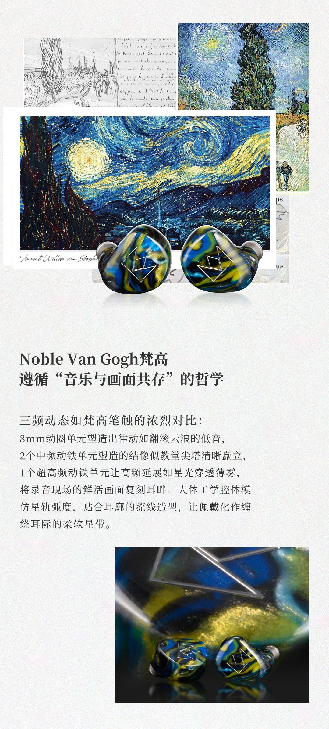 Van Gogh 梵高耳機(jī)以梵高名作《星夜》為靈感,將鳶尾藍(lán)腔體的粗糲油彩質(zhì)感與星空漩渦般的人體工學(xué)設(shè)計(jì)融合,打造可穿戴的藝術(shù)單品。聲學(xué)上采用 4 單元混合架構(gòu) ——8mm 雙磁路動(dòng)圈單元帶來如翻滾云浪的低頻律動(dòng),2 顆 Sonion 動(dòng)鐵單元精準(zhǔn)呈現(xiàn)中頻人聲的細(xì)膩情感,1 顆 Knowles 極高頻動(dòng)鐵單元演繹星光穿透薄霧般的高頻延展,三頻動(dòng)態(tài)對(duì)比鮮明如梵高筆觸,搭配 107dB 靈敏度與 29Ω 阻抗,手機(jī)直推即可釋放 20Hz-20kHz 全頻段鮮活聽感。星軌弧度腔體貼合耳廓,8 芯 OCC 單晶銅線材呼應(yīng)畫作元素,讓佩戴成為纏繞耳際的舒適星帶。
